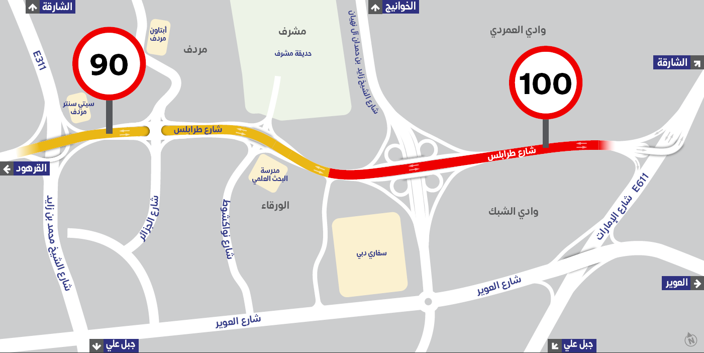 قررت هيئة الطرق والمواصلات والقيادة العامة لشرطة دبي، زيادة حد السرعة القانونية من 80 إلى 100 كلم/ ساعة على شارع طرابلس من شارع الإمارات إلى ما قبل شارع نواكشوط وزيادة حد السرعة إلى 90 كلم/ساعة من قبل شارع نواكشوط إلى شارع الشيخ محمد بن زايد، ابتداء من تاريخ 25 أكتوبر الجاري.