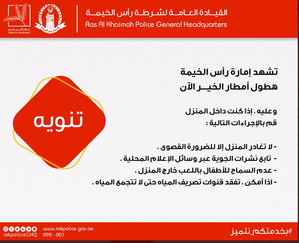 دعت القيادة العامة لشرطة رأس الخيمة، بضرورة توخي الحيطة والحذر وتجنب الخروج من المنازل اثناء هطول الأمطار الا للضرورة القصوى وعدم السماح للأطفال باللعب خارج المنزل، جاء ذلك بعد ان شهدت الكثير من مناطق الإمارة هطول أمطار غزيرة وهو الأمر الذي دعها إلى التنويه.
