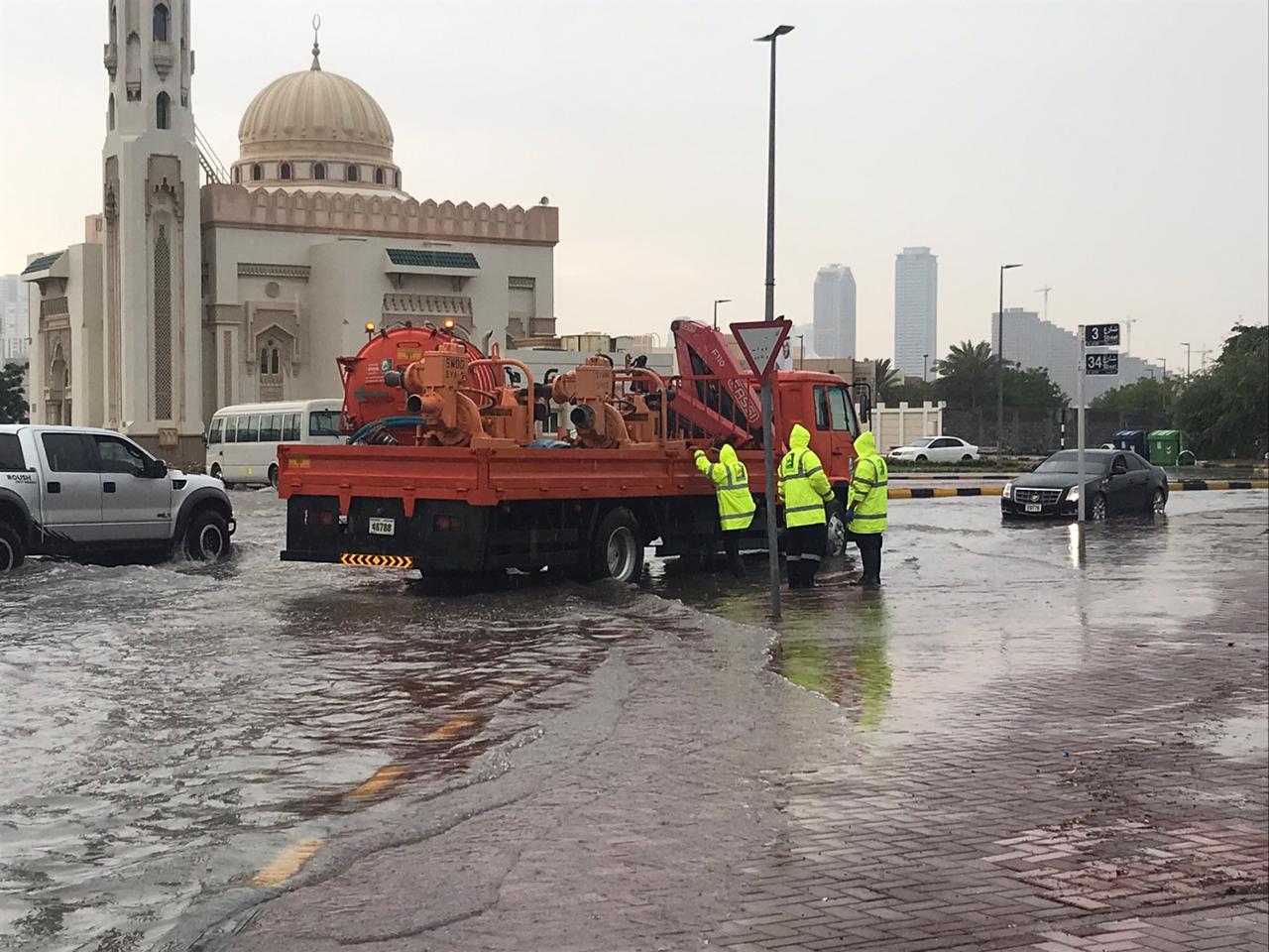 من جانبه أوضح المهندس حسن التفاق مساعد المدير العام لقطاع الزراعة والبيئة أن أمطار الخير التي هطلت على مدينة الشارقة متفاوتة في كثافتها بين المتوسطة والغزيرة و قد تحركت الفرق العاملة في طوارئ الأمطار التابعة للجنة الميدانية التي كانت على أهبة الاستعداد إلى مواقع العمل للتعامل مع تجمعات الأمطار وفقاً للخطة المعدة مسبقاً و باشرت الفرق عملها في تصريف مياه الأمطار التي تجمعت بالطرقات الرئيسة المنخفضة والمواقع التي لا توجد بها شبكات لتصريف مياه الأمطار، حيث تم توزيع 80 صهريجاً و 160 مضحة متنقلة تابعة للبلدية بالإضافة لمحطة السد في مواقع تجمعات الأمطار المختلفة بمدينة الشارقة استعداداً لسحب المياه المتجمعة وأية أعمال طوارئ متوقعة وذلك بالتنسيق مع القيادة العامة لشرطة الشارقة لتسهيل و ضمان انسيابية الحركة المرورية بالمدينة.