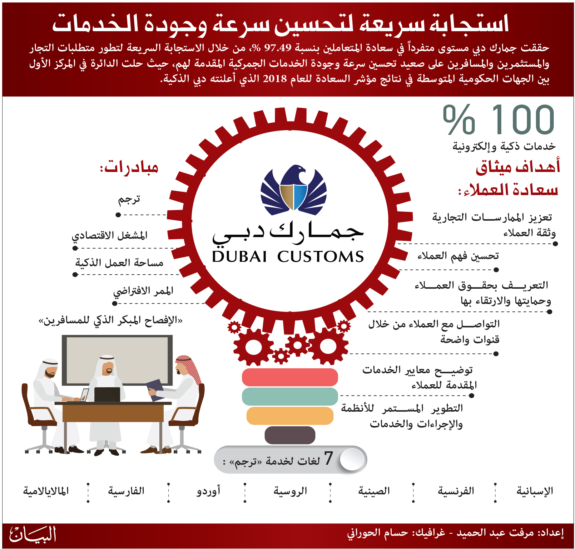 وتعتبر جمارك دبي كذلك رائدة في تجربة تقديم الخدمات الذكية بنسبة 100% التي يمكن الولوج إليها عبر الأجهزة الذكية دون الحاجة إلى زيارة مقرات المراكز الجمركية، حيث يمكن للمتعامل الوصول إلى الخدمات من موقعه في أي وقت وأي مكان، حيث تعتبر الخدمات الذكية أحد الأسباب التي عززت تحسين تجربة المتعاملين بالدائرة، ما جعلها تتصدر مؤشر سعادة المتعاملين، حيث حققت أعلى نسبة في مؤشر سعادة المتعاملين في النصف الأول من العام الجاري بنسبة 98%، و97.49% في 2018، حيث حلت الدائرة في المركز الأول بين الجهات الحكومية المتوسطة، حيث بلغ عدد الأصوات التي حصلت عليها جمارك دبي 1.75 مليون صوت تمثل 21.87% من إجمالي عدد الأصوات في مؤشر السعادة للعام 2018، فيما بلغ عدد أصوات التي أعطاها المتعاملون للخدمات الإلكترونية والخدمات الذكية بالدائرة 1.5 مليون صوت تمثل نسبة 98.23% من إجمالي عدد الأصوات التي أعطيت لهذه الخدمات في مؤشر السعادة للعام 2018.