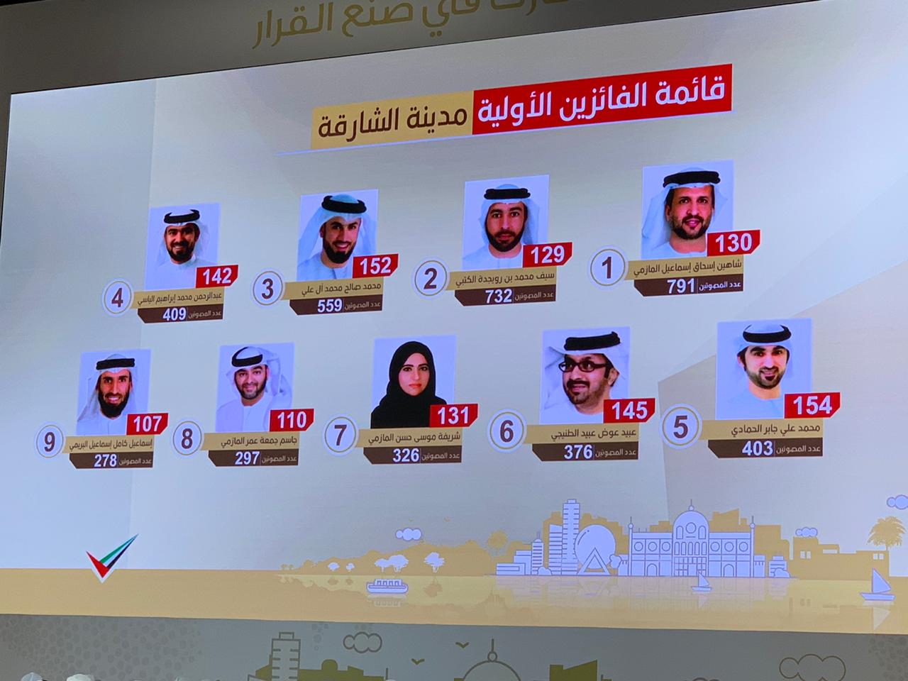 أعلنت اللجنة العليا بانتخابات المجلس الاستشاري أسماء الفائزين في الدائرة الانتخابية لمدينة الشارقة وهم: