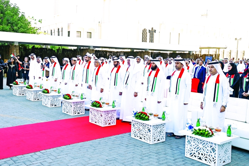 وبدأ الاحتفال بالسلام الوطني لدولة الإمارات، حيث ردد الحضور النشيد الوطني بصوت واحد معربين عن فرحتهم بهذه المناسبة العزيزة على قلوب الجميع، مستذكرين السيرة العطرة للآباء المؤسسين الذين أسسوا صرح الاتحاد، والجهود الجبارة التي بذلوها حتى يبقى صرح الاتحاد شامخاً.