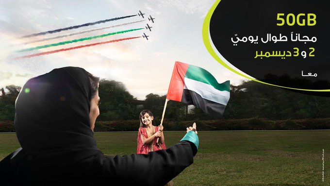 أهدت شركة  اتصالات عملاءها الإماراتيين  50GB انترنت مجاناً يومي 2  و 3 ديسمبر احتفالا باليوم الوطني.