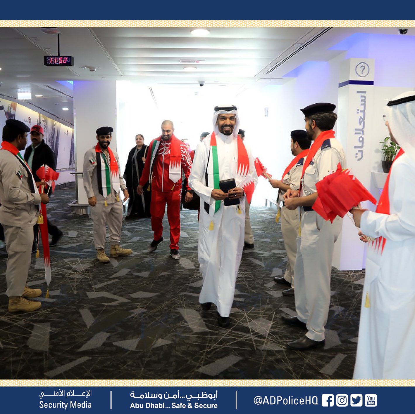 استقبلت إدارة شرطة أمن مطار أبوظبي بمديرية شرطة أمن المنافذ والمطارات بقطاع شؤون الأمن والمنافذ في شرطة أبوظبي الأشقاء البحرينيين القادمين إلى مطار أبوظبي الدولي بالورد والأعلام والحلوى ابتهاجًا بمناسبة اليوم الوطني الثامن والأربعين والذي يصادف اليوم السادس عشر من ديسمبر.