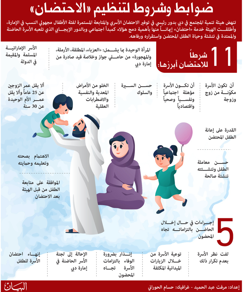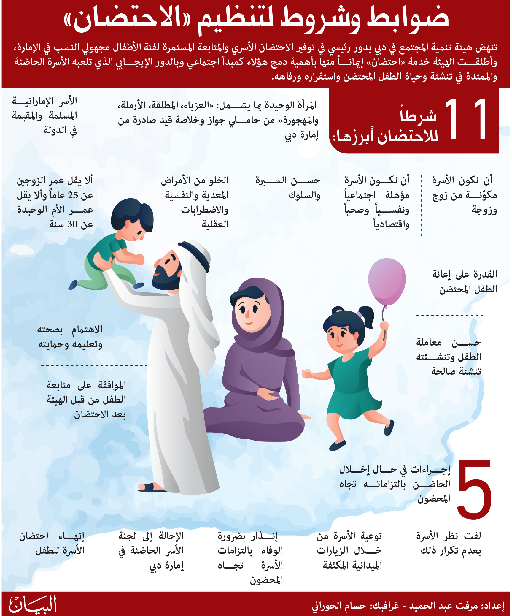وأوضح لـ«البيان»: «أن هناك معايير وشروطاً لاختيار العائلات الحاضنة، كما تعمل الهيئة على متابعة حالة الطفل المحضون بعد أن تتسلمه العائلة للتأكد من استمرار استيفاء الشروط والمعايير المطلوبة، إيماناً منها بأهمية دمج هؤلاء كمبدأ اجتماعي وبالدور الإيجابي الذي تلعبه الأسرة الحاضنة والممتدة في تنشئة وحياة الطفل المحتضن واستقراره».
