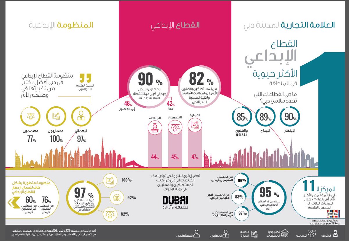 وأظهر الاستطلاع، الذي اعتمد على مجموعة من المعايير المحددة والواضحة، جاءت متوافقة مع مؤشرات دولية ذات صلة على النطاق العالمي، مجموعة من النتائج المهمة من أبرزها تأكيد 95% من المشاركين أن دبي تمتلك قطاعًا إبداعيًا نشطًا وحيوياً، وهي النسبة الأكبر على الصعيد الإقليمي، فيما وصف 90% من المشاركين في الاستطلاع دبي كمدينة "مبتكرة"، بينما رأى 89% ممن شملهم الاستطلاع أنها "مبدعة"، فيما فضّل 82% منهم الإنتاجات الفنية والثقافية المحلية في إمارة دبي بالمقارنة مع بلدانهم، فيما أكد 90% من المشاركين حرصهم على حضور الأنشطة الثقافية والفنية المحلية المقامة في دبي، في حين أوضح التقرير أن 76% من العاملين في القطاع الثقافي والفني في دبي و60% من المتخصصين في ذات القطاع في دولة الإمارات يرون أن دبي تمتلك المقومات والإمكانات اللازمة لضمان ازدهار ونمو القطاع الإبداعي في ضوء ما حققته الإمارة من إنجازات في هذا المضمار خلال السنوات الأخيرة.