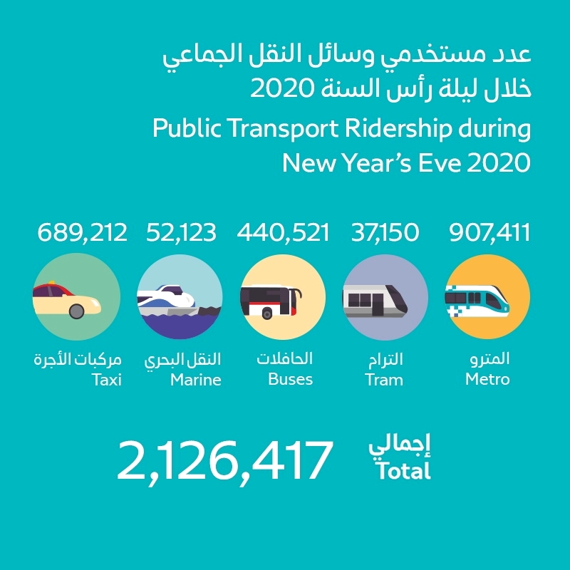 أعلنت هيئة الطرق والمواصلات في دبي أن عدد مستخدمي وسائل النقل الجماعي خلال الاحتفال بفعاليات رأس السنة الميلادية 2020 وصل إلى مليونين و126 ألفاً و417 راكباً، بزيادة بلغت 3.6% من إجمالي عدد ركاب الفترة نفسها من العام الماضي.