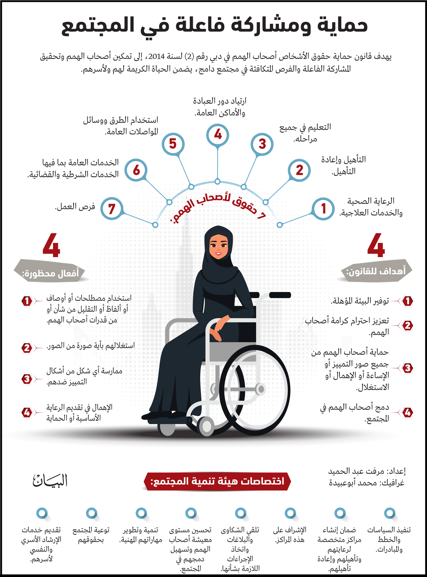 أشارت مريم البلوشي إلى أن القانون الذي صدر في دبي عام 2014 بشأن حماية حقوق أصحاب الهمم لم تصدر لائحته التنفيذية حتى الآن، مشيرة إلى أنه يرمي إلى ضمان تمتع الأشخاص أصحاب الهمم بجميع حقوقهم المقررة لهم، وتعزيز احترامهم وحفظ كرامتهم وإبراز قدراتهم في البناء والتطوير.