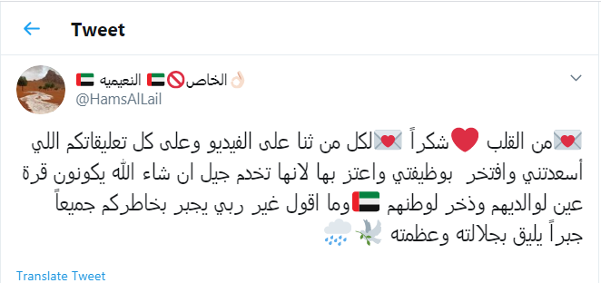 وشكرت "ماما شيخة" في تغريدة نشرتها صباح اليوم جميع من أثنى على الفيديو الذي يظهر استقبالها الجميل للأطفال في بداية اليوم الدراسي، وانتشر عبر مواقع التواصل الاجتماعي بشكل كبير، وقالت: "شكراً لكل من أثنى على الفيديو وعلى كل تعليقاتكم التي أسعدتني وافتخر بوظيفتي واعتز بها لأنها تخدم جيل ان شاء الله يكونون قرة عين لوالديهم وذخر لوطنهم."
