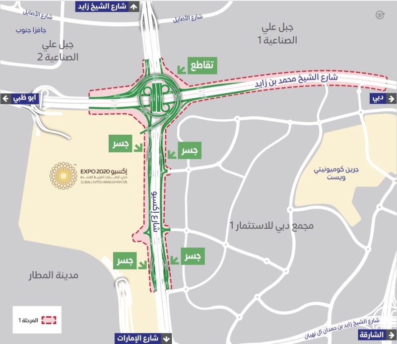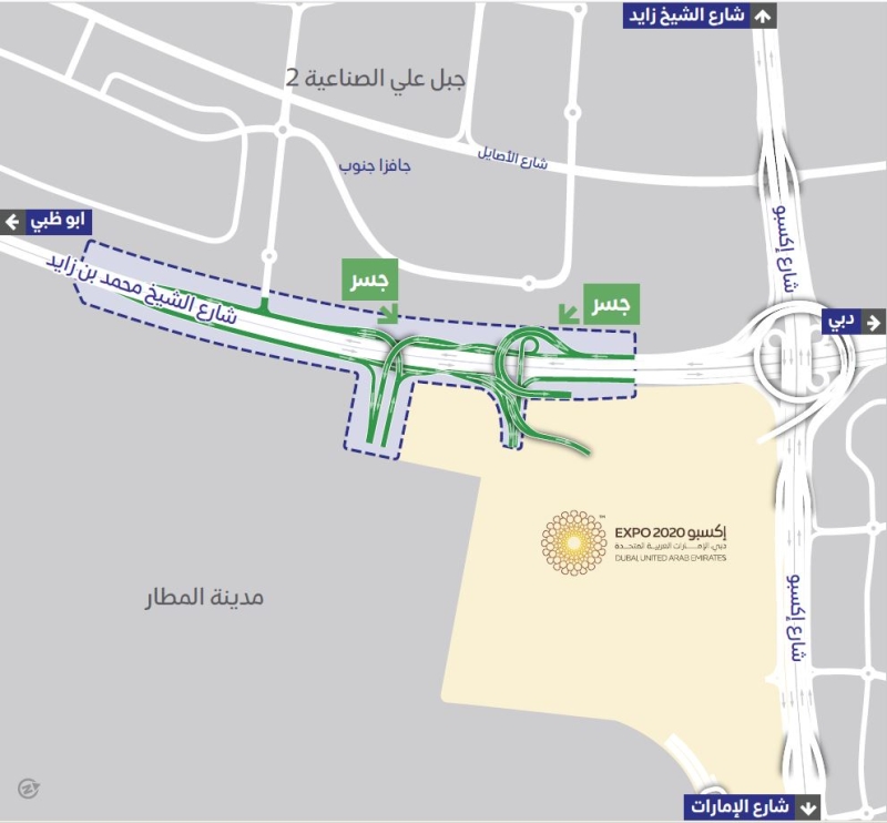 وكذلك الحركة المرورية من شارع إكسبو باتجاه شارع الشيخ زايد، إلى جانب تسهيل الحركة المرورية القادمة من شارع إكسبو شمالاً إلى شارع الشيخ محمد بن زايد باتجاه دبي، ومن شارع إكسبو جنوباً إلى شارع الشيخ محمد بن زايد باتجاه أبوظبي، كما تضمنت تنفيذ أعمال طرق بطول 27 كيلومتراً على شارع إكسبو، وتوسعته من أربعة مسارات إلى ستة مسارات في كل اتجاه، وإنشاء طرق خدمة في كلا الاتجاهين، وتنفيذ أربعة جسور في أجزاء منه، وذلك لتوفير الحركات المرورية من وإلى شارع إكسبو باتجاه موقع المعرض.