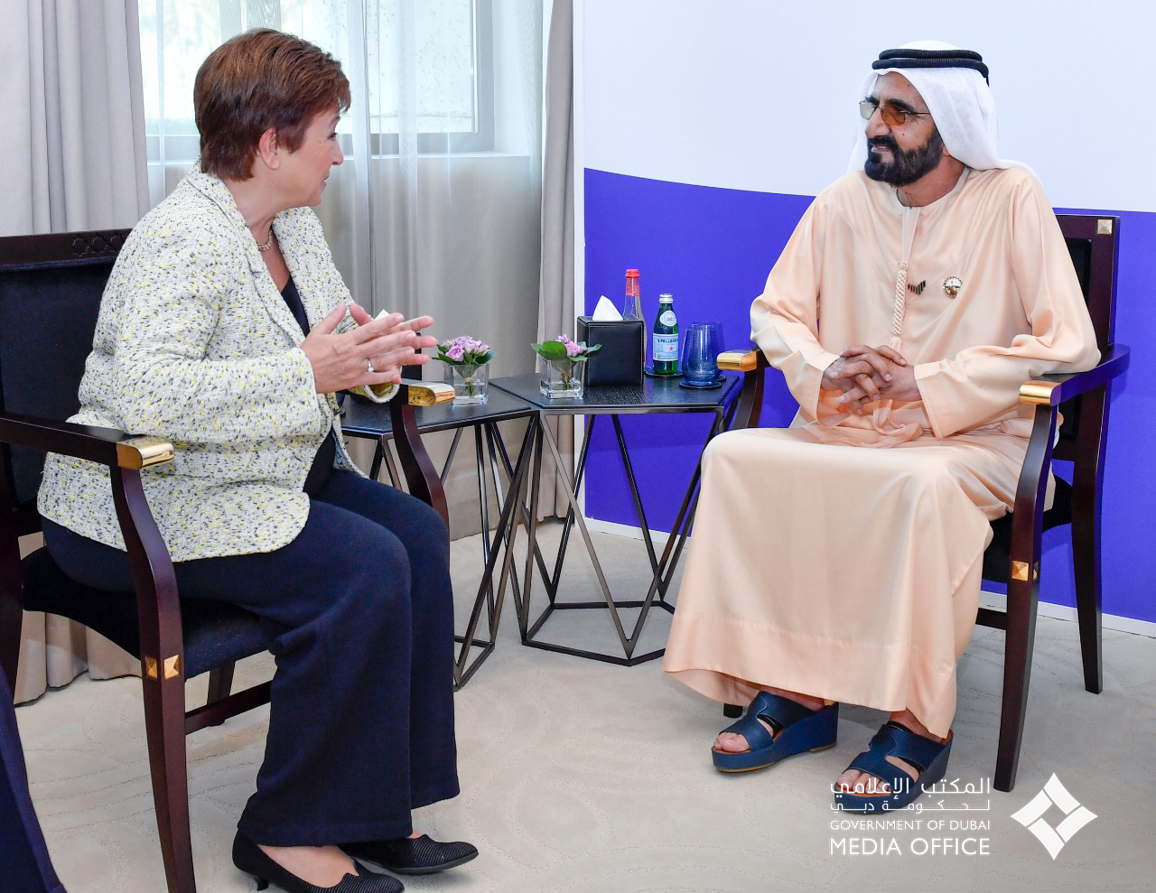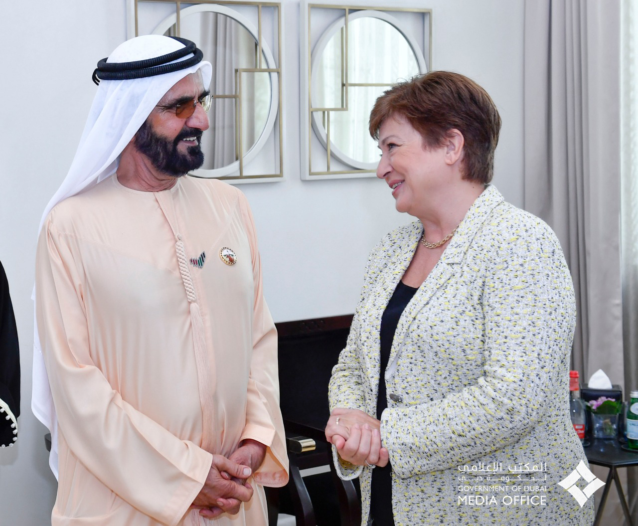 استقبل صاحب السمو الشيخ محمد بن راشد آل مكتوم، نائب رئيس الدولة رئيس مجلس الوزراء حاكم دبي "رعاه الله"، بحضور سمو الشيخ حمدان بن محمد بن راشد آل مكتوم، ولي عهد دبي، السيدة كريستالينا غورغييفا، رئيسة صندوق النقد الدولي، وذلك على هامش أعمال منتدى المرأة العالمي- دبي 2020 المقام في مدينة جميرا يومي 16-17 فبراير الجاري.
