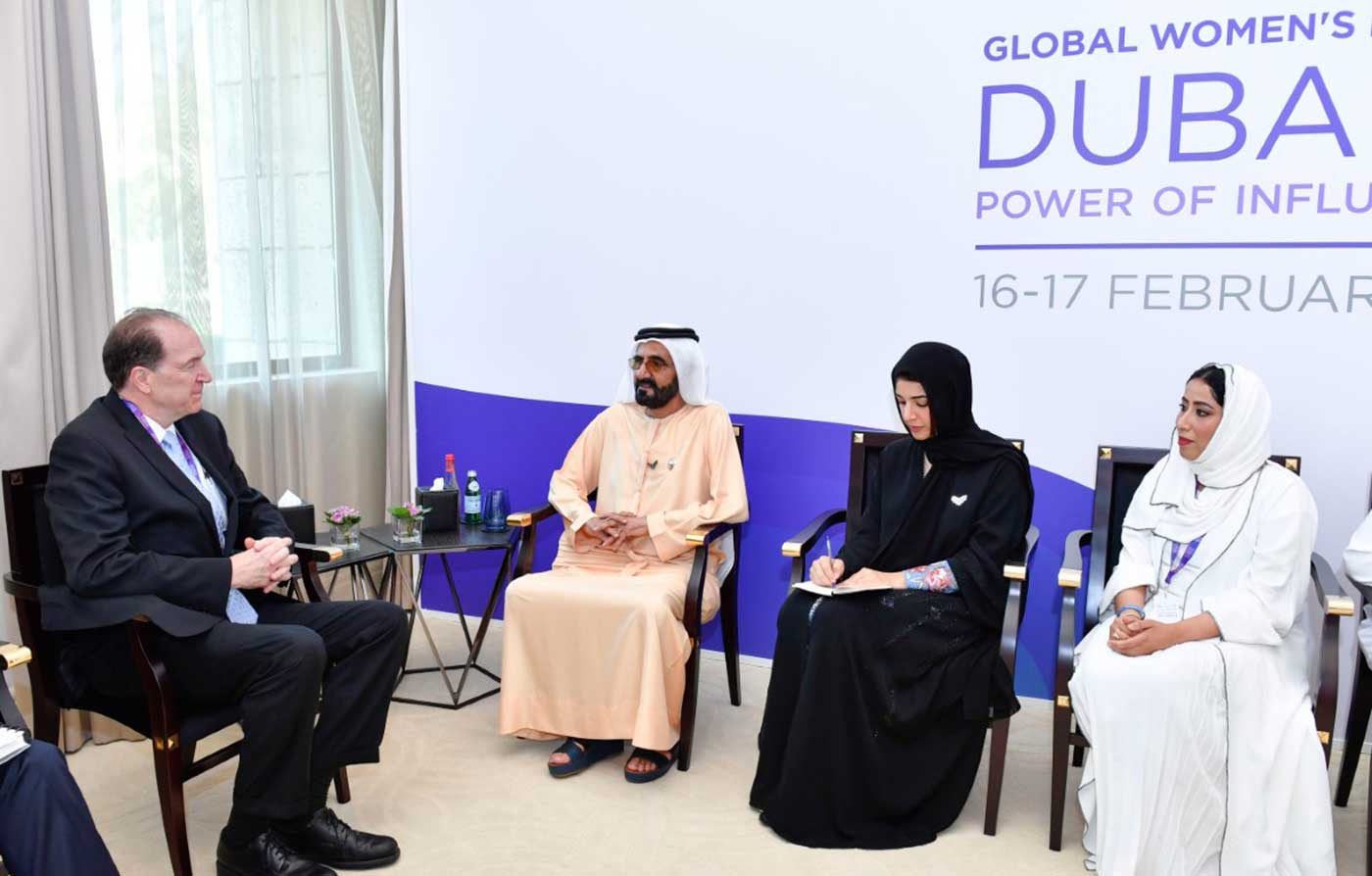 استقبل صاحب السمو الشيخ محمد بن راشد آل مكتوم نائب رئيس الدولة رئيس مجلس الوزراء حاكم دبي "رعاه الله"، بحضور سمو الشيخ حمدان بن محمد بن راشد آل مكتوم، ولي عهد دبي، ديفيد مالباس، رئيس مجموعة البنك الدولي، والوفد المرافق، وذلك على هامش أعمال منتدى المرأة العالمي- دبي 2020 المُقام في دبي خلال الفترة من 16-17 فبراير الجاري.