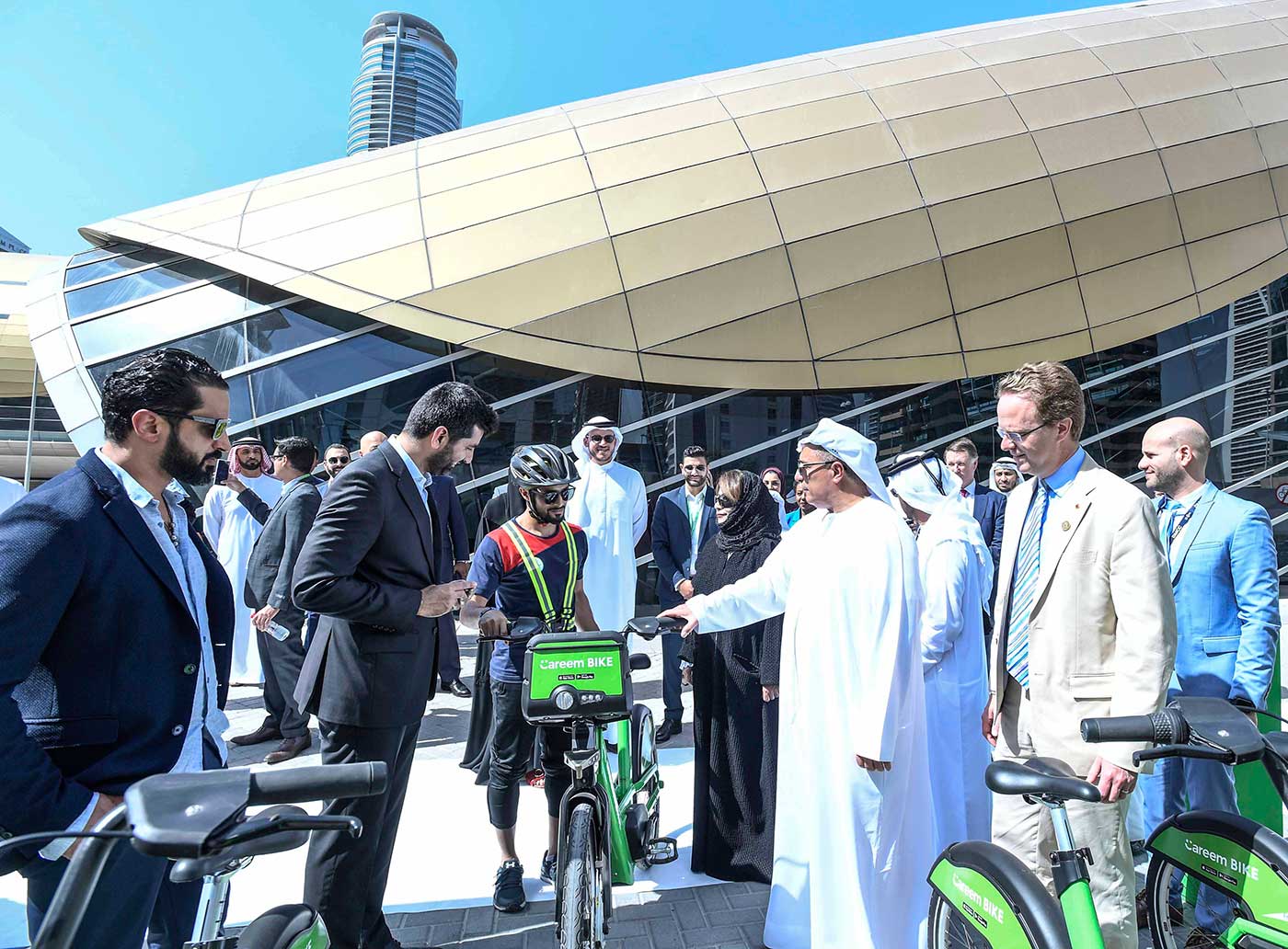 ودشن معالي مطر محمد الطاير المدير العام ورئيس مجلس المديرين في هيئة الطرق والمواصلات، والسيد مُدثّر شيخة الشريك المؤسس والعضو المنتدب لشركة (كريم)، والسيد أحمد بن سليم الرئيس التنفيذي لمركز دبي للسلع المتعددة، الخدمة في محطة الدراجات بمنطقة أبراج بحيرات جميرا، بحضور عدد من المديرين التنفيذيين في الهيئة ومسؤولي شركة (كريم).