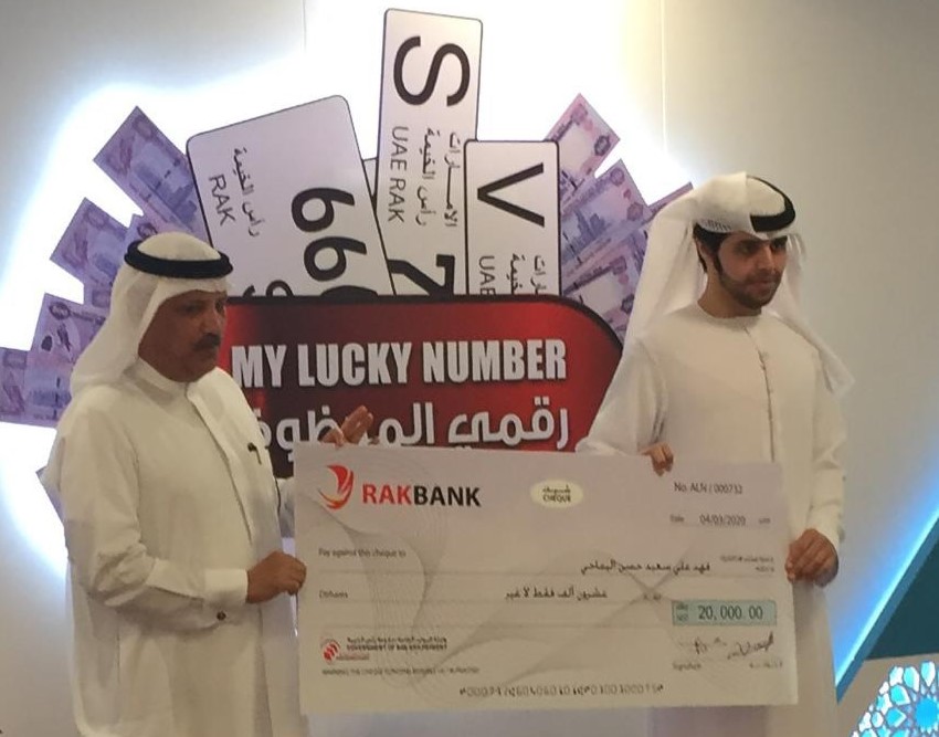 سلم جمال أحمد الطير رئيس مجلس إدارة هيئة الموارد العامة في رأس الخيمة المواطن فهد علي سعيد اليماحي – 22 عاما - الفائز الثالث بمبادرة رقمي المحظوظ الشهرية، شيكا بمبلغ 20 ألف درهم.