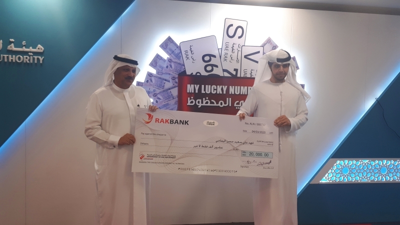 سلّم جمال أحمد الطير رئيس مجلس إدارة هيئة الموارد العامة في رأس الخيمة، المواطن فهد علي سعيد اليماحي - 22 عاماً - الفائز الثالث بمبادرة رقمي المحظوظ الشهرية، شيكاً بمبلغ 20 ألف درهم.