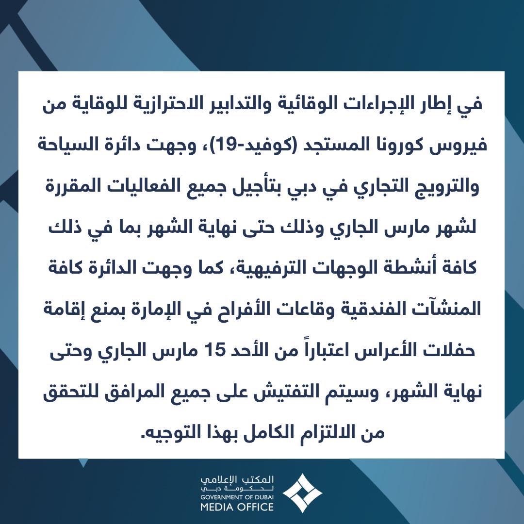 في إطار الإجراءات الاحترازية والوقاية من فيروس كورونا المستجد "كوفيد- 19" وجهت دائرة السياحة والترويج التجاري في دبي بتأجيل جميع الفعاليات المقررة لشهر مارس الجاري في دبي حتى نهاية الشهر بما في ذلك كافة أنشطة الوجهات الترفيهية، ومنع المنشآت الفندقية وقاعات الأفراح من إقامة حفلات الأعراس اعتباراً من الأحد 15 مارس وحتى نهاية الشهر، وسيتم التفتيش على جميع المرافق للتحقق من الالتزام الكامل.