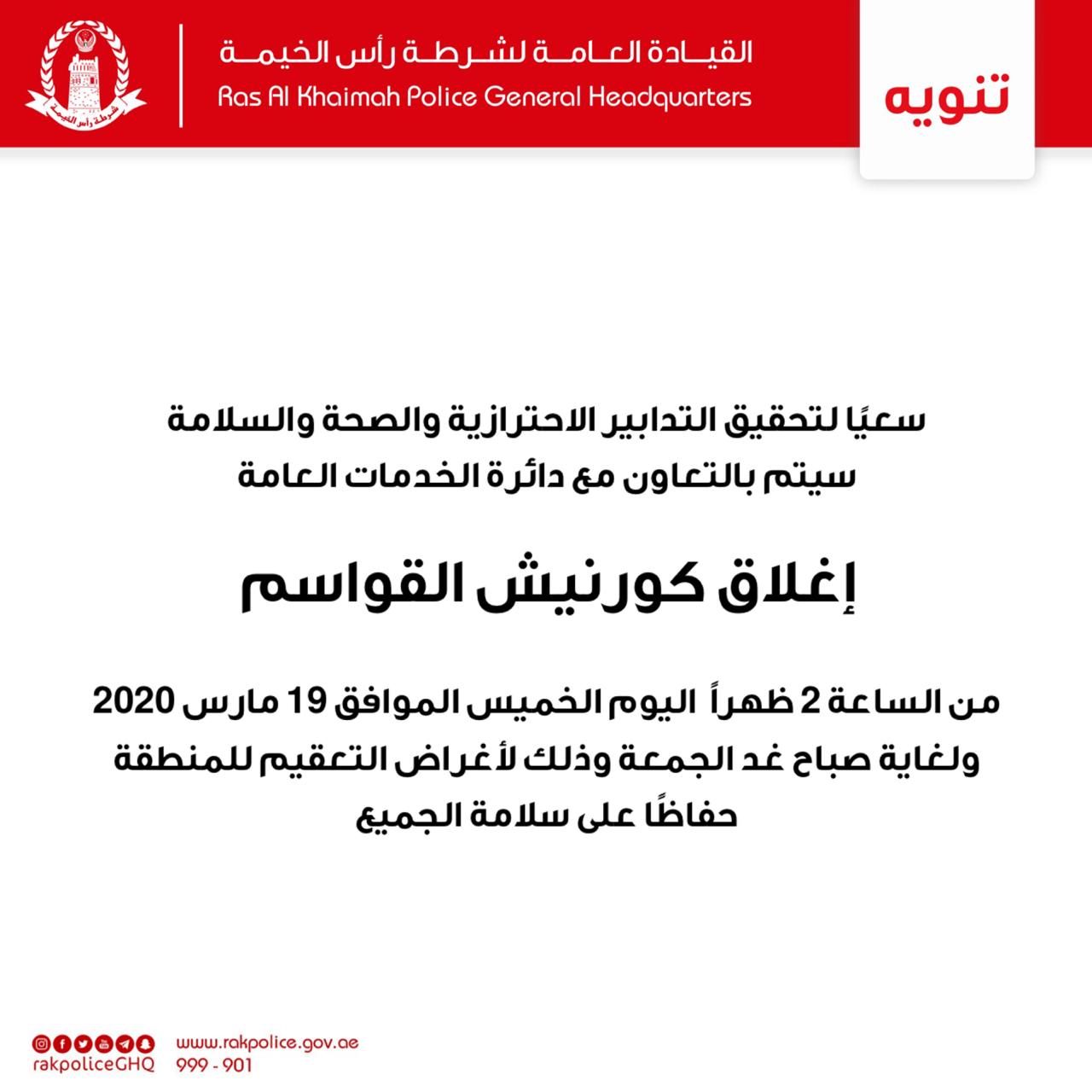 كشفت القيادة العامة لشرطة رأس الخيمة بالتعاون مع دائرة الخدمات العامة، عن إغلاق كورنيش القواسم من الساعة الثانية ظهر اليوم الخميس 19 مارس وحتى صباح الغد الجمعة 20 مارس، وذلك لأغراض التعقيم للمنطقة حفاظاً على سلامة الجميع، وسعياً لتحقيق التدابير الاحترازية والصحة والسلامة العامة.