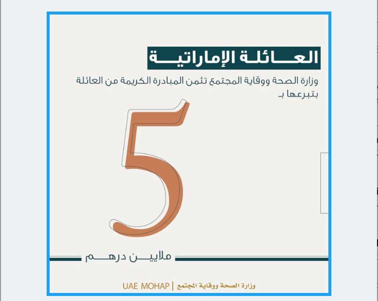 تبرعت عائلة إماراتية بمبلغ 5 ملايين درهم لوزارة الصحة ووقاية المجتمع لدعم الجهود الوطنية المبذولة لمكافحة فيروس كورونا المستجد، مقدمة بذلك صورة مشرفة من التكاتف والتعاضد الوطني.