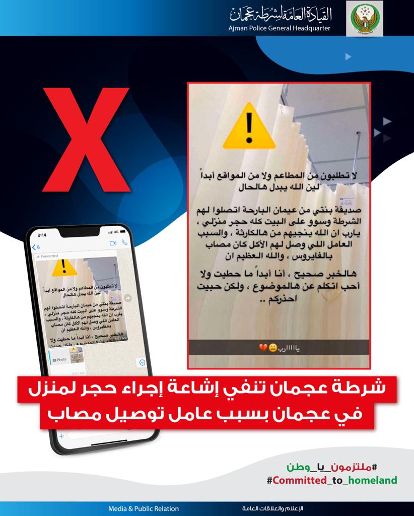 وأكد العميد عبد الله سيف المطروشي مدير عام العمليات الشرطية في القيادة العامة لشرطة عجمان أن الإشاعة التي تم نشرها في برنامج التواصل الاجتماعي ( واتساب ) حول قيام شرطة عجمان بإجراء حجر على منزل في إمارة عجمان بسبب طعام تم توصليه لهم من قبل عامل مطعم مصاب بفيروس كورونا، كلام غير صحيح.