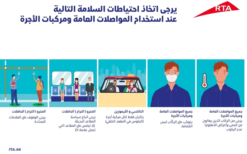 ضمن الإجراءات الاحترازية لضمان أعلى مستويات الحماية، أعلنت هيئة الطرق والمواصلات عن إجراءات إضافية لحماية صحة مستخدمي وسائل المواصلات العامة، شملت التحكم في عدد ركاب مترو دبي وحافلات المواصلات العامة في كل رحلة للحفاظ على مسافة آمنة بين الركاب، مع إغلاق المحطات المكيفة المخصصة لانتظار الحافلات.