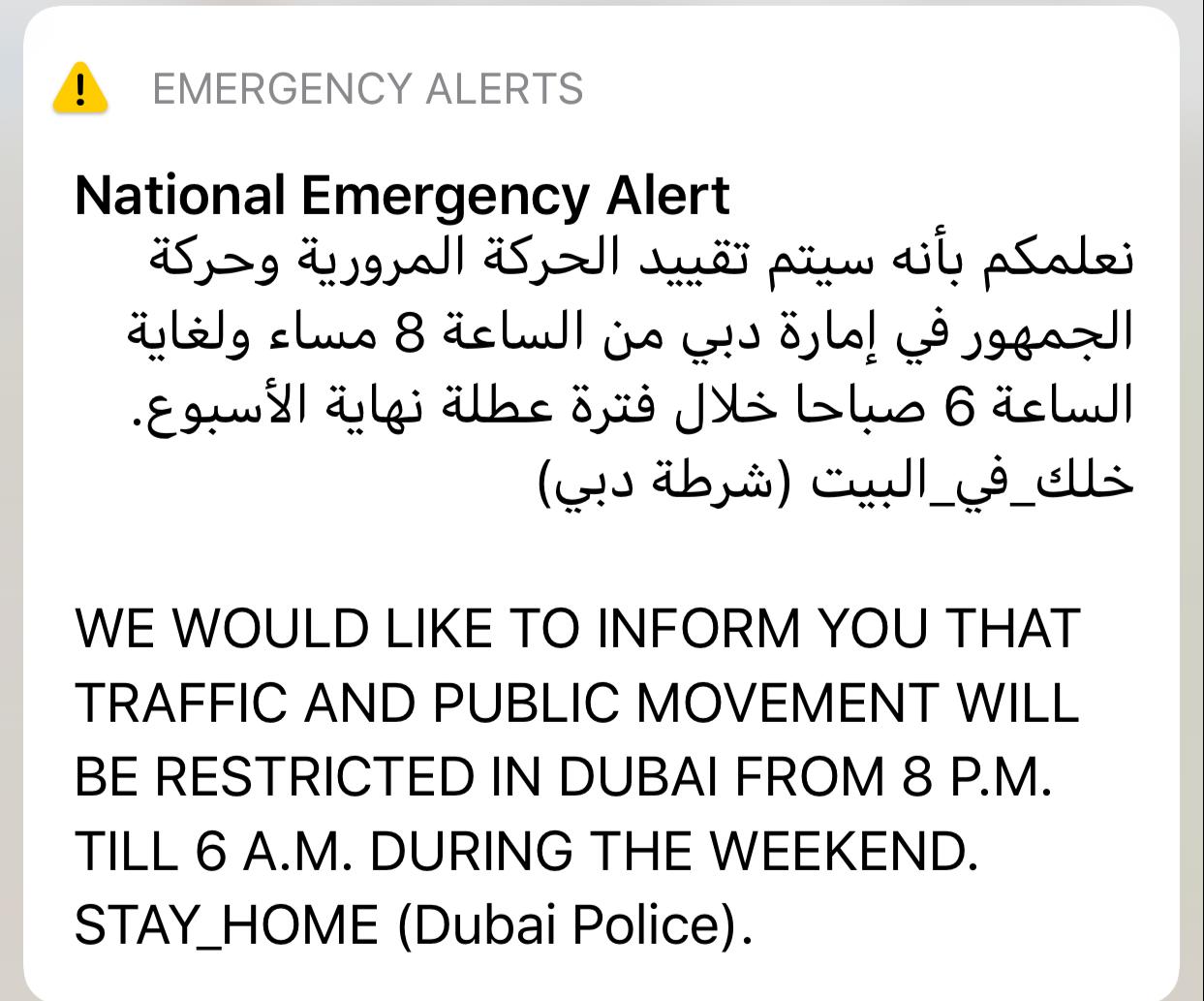 بدأت شرطة دبي في بث الرسائل التوعوية للجمهور من قاطني الإمارة بضرورة الالتزام بالتعليمات والقواعد التي فرضتها الدولة لحمايتهم عبر مواقع التواصل الاجتماعي وعبر نشر الدوريات التي تحمل مكبرات الصوت تناشدهم بالبقاء في المنزل لحمايتهم وتجنبا للمساءلة القانونية.