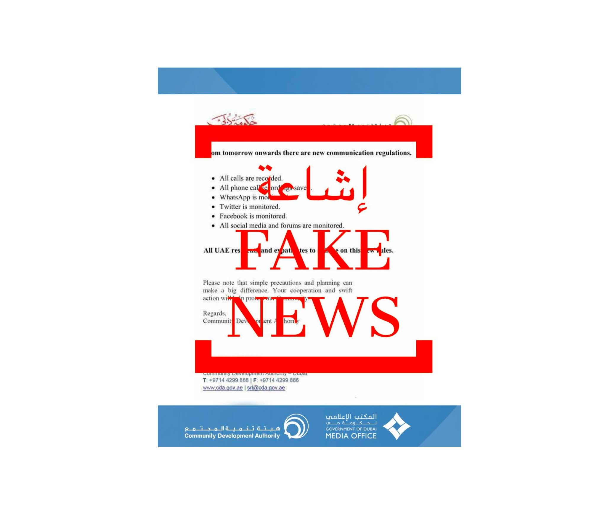 نفت هيئة تنمية المجتمع في دبي ما تم تناقله مؤخراً عبر وسائل التواصل الاجتماعي حول إصدار الهيئة لتعميم حول اعتماد إجراءات استثنائية بشأن قطاع الاتصالات وتحديداً فيما يتعلق بالمحادثات الهاتفية ومنصات التواصل الاجتماعي مثل: واتساب وتويتر وفيسبوك وغيرها,مؤكدة أن التعميم الذي تم تداوله لا صحة له على الإطلاق.