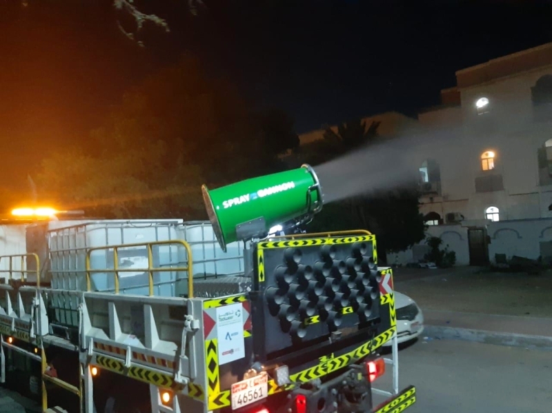 وأوضح الكعبي أن المركز يباشر التعقيم باستخدام سيارة متطورة تتجاوز تكلفتها 2.5 مليون درهم، تمتلك تدوير منها حالياً معدة واحدة تستخدم في غسيل الأنفاق في مدينة أبوظبي، وتتميز الآلية باحتوائها أجهزة الاستشعار عن بعد، هذا بالإضافة إلى شريط رذاذ عالي الضغط مكون من 3 أقسام بإجمالي 48 فوهة نفاثة مسطحة، هذا بالإضافة إلى وظيفة الركن التلقائية، والحماية من الاصطدام والحمل الزائد، وتستخدم الآلية في تنظيف جدران الأنفاق، وأسطح الطرق، ولها القدرة على رش المواد التعقيمية بشكل أفقي من جانبيها لمسافة تصل إلى 20 متراً.