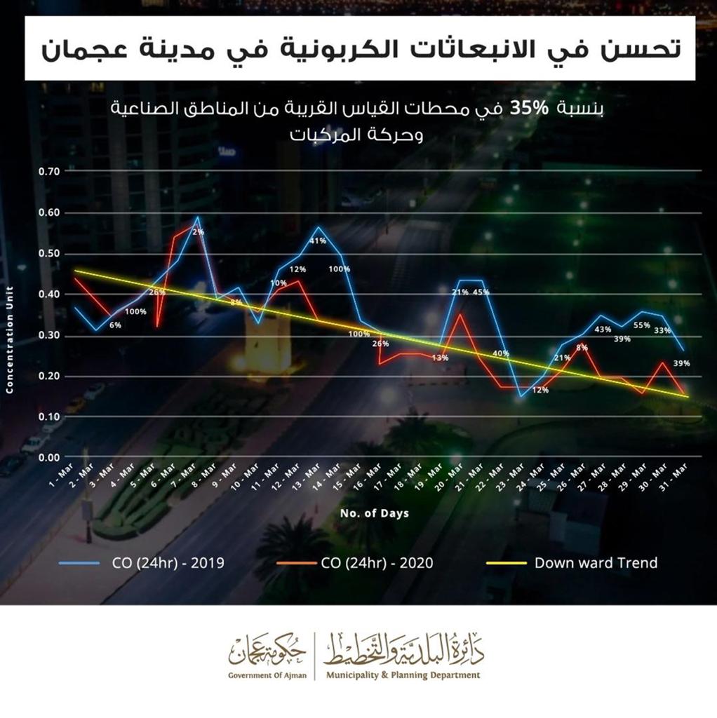 كشفت التقارير الصادرة عن دائرة البلدية والتخطيط في عجمان عن تحسّن ملحوظ في جودة الهواء لبعض الغازات بنسبة تصل إلى 55%، والتي تأتي نتيجة إجراءات البرنامج الوطني للتعقيم وتقييد حركة المركبات، وتتمثل متابعة الدائرة لجودة الحياة برقابتها المستمرة على مدار الساعة في ظل الظروف الحالية، وتسخيرها لأحدث التقنيات العالمية، مثل تبنيها للمركبة التي تعمل بالذكاء الاصطناعي للرقابة الفورية للانبعاثات، والتي تعد أيضاً صديقة للبيئة.