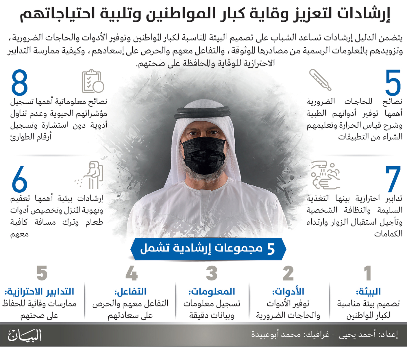وتذكيرهم بالإجراءات الاحترازية، ومساعدتهم في وقاية أنفسهم من الأمراض والأوبئة، خاصة في ظل الظروف الراهنة». وأشار سعادته، إلى أن الدليل يقدم للشباب فرصة لكسب مهارات جديدة، والتعلم من خبرات كبار المواطنين، والتعرف إلى تجاربهم أثناء مواجهتهم لتحديات وظروف مشابهة للتي نعيشها اليوم.