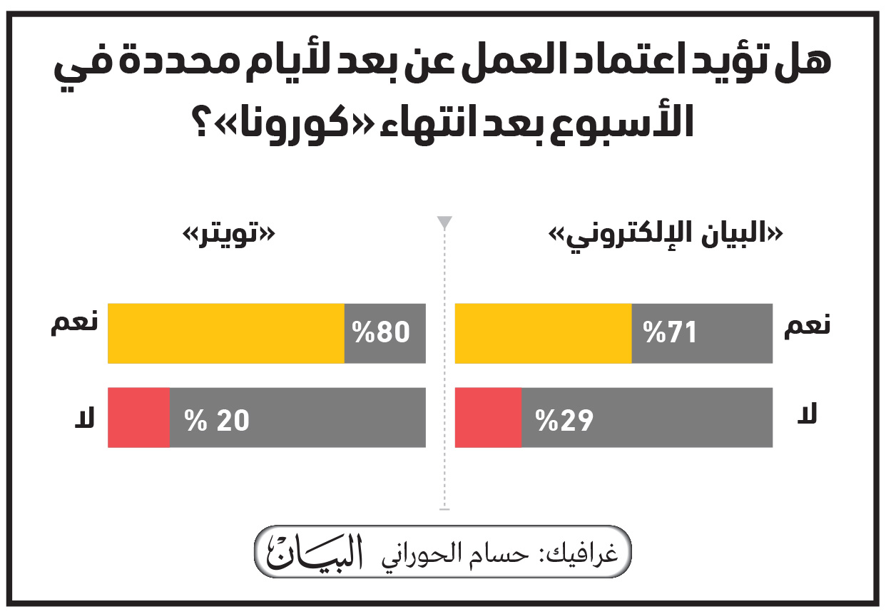 إلى ذلك أكد غالبية المستجيبين لاستطلاع «البيان» الأسبوعي، تأييدهم لاعتماد العمل عن بُعد لأيام محددة في الأسبوع، بعد انتهاء جائحة «كورونا»، حيث أيد 71% من المُستطلعين عبر موقع «البيان الإلكتروني»، أهمية تطبيق العمل عن بُعد في أغلب الوظائف لأيام محددة، فيما صوت 29% منهم لاستمرار العمل بالطرق الطبيعية بعد زوال الجائحة. وفي ذات الاستطلاع، وعلى حساب «البيان» عبر موقع التواصل الاجتماعي «تويتر»، صوت 80% لأهمية تطبيق العمل عن بُعد، بشكل دائم في بعض القطاعات، فيما صوت 20% منهم لاستمرارية مواصلة العمل بشكله الاعتيادي.