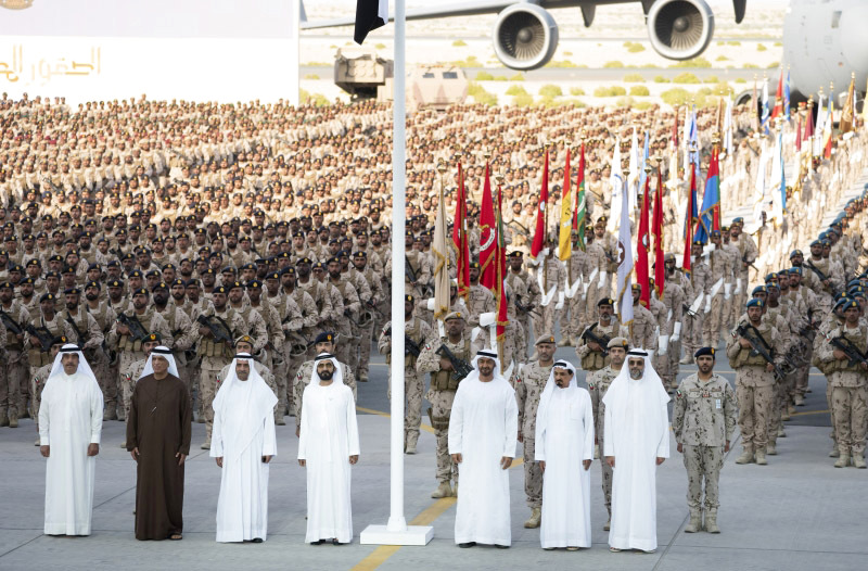 وتلاقت في ذلك اليوم إرادة الباني والمؤسس المغفور له بإذن الله تعالى، الشيخ زايد بن سلطان، طيب الله ثراه، وإخوانه أصحاب السموّ أعضاء المجلس الأعلى للاتحاد حكام الإمارات، في بناء قوة عسكرية عصرية متطورة يفخر بها الجميع، تنشر الأمن والأمان في ربوع الوطن وتعزز من استقراره، تسالم من يسالمها وتعادي من يعاديها، ويروي جنودها البواسل بدمائهم تراب الوطن.