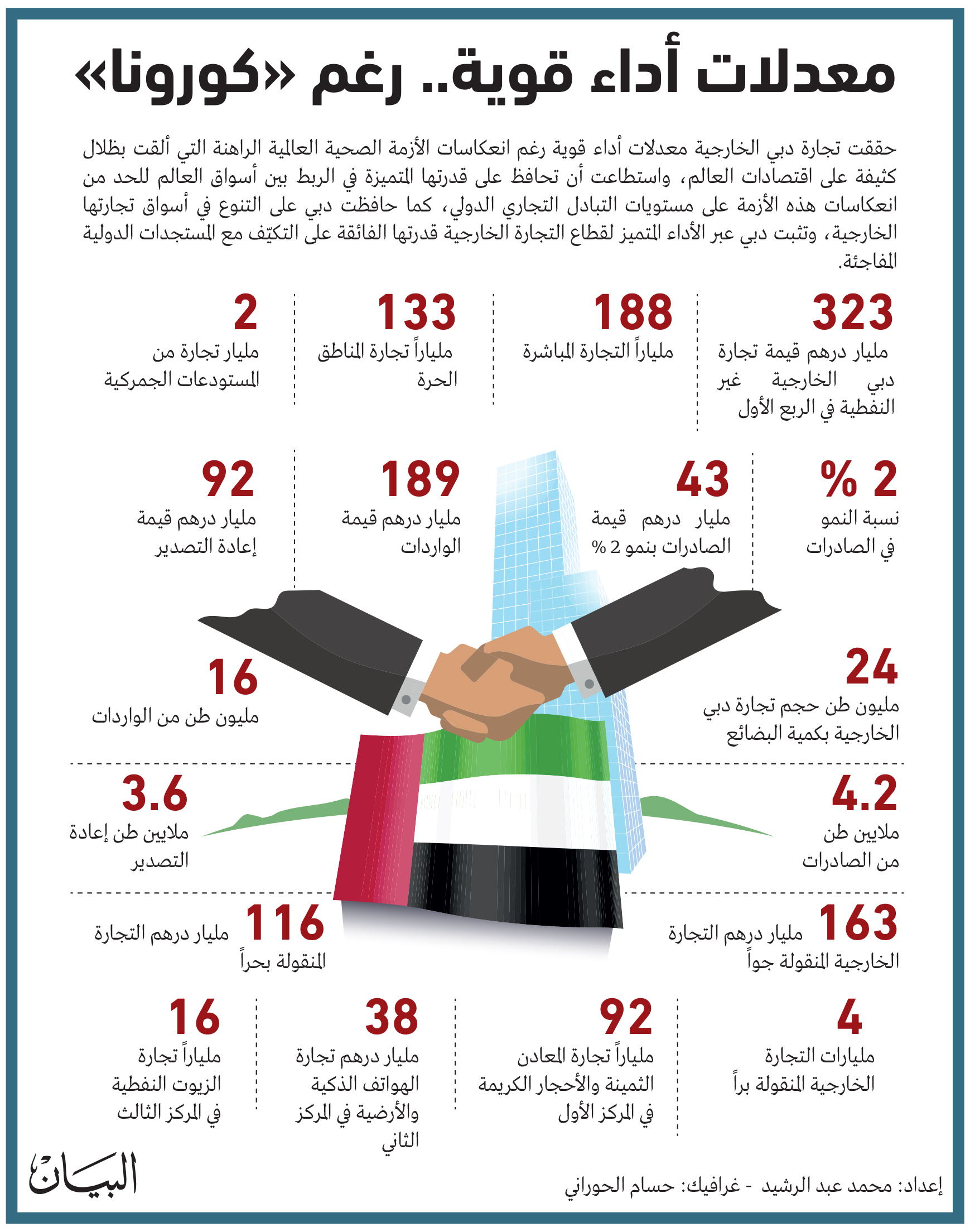 تمكنت دبي من احتواء تأثير التباطؤ الاقتصادي العالمي الناجم عن جائحة «كورونا» المستجد «كوفيد 19» وانعكاساتها السلبية على حركة التجارة الدولية، وجاءت التجارة الخارجية للإمارة بمعدلات أداء قوية رغم انعكاسات الأزمة الصحية العالمية الراهنة التي ألقت بظلال كثيفة على اقتصادات العالم، حيث بلغت قيمة تجارة دبي الخارجية غير النفطية في الربع الأول من العام 2020 نحو 323 مليار درهم، وحققت دبي خلال هذه الفترة نمواً في الصادرات بنسبة 2 % مقارنة بالفترة نفسها من العام 2019 لتصل قيمة صادرات دبي في الربع الأول من العام 2020 إلى 43 مليار درهم، فيما بلغت قيمة الواردات 189 مليار درهم وقيمة إعادة التصدير 92 مليار درهم.