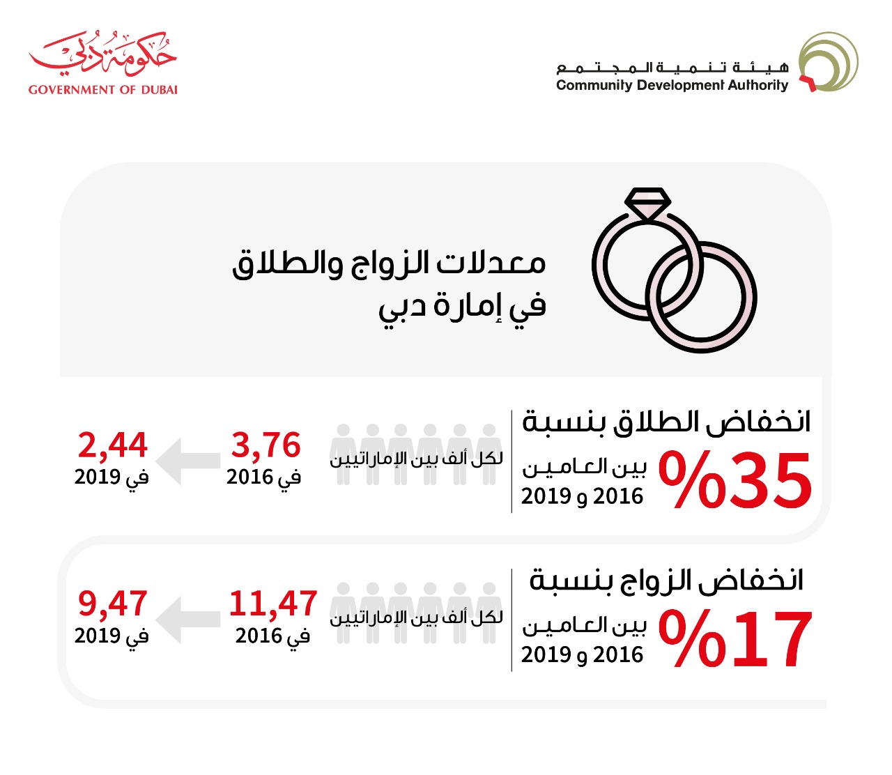 كشف تقرير إحصائي أعده مركز دبي للإحصاء بالتعاون مع هيئة تنمية المجتمع ومحاكم دبي حول معدلات الطلاق والزواج في إمارة دبي على مدار أربع سنوات، انخفاضاً في الطلاق بنسبة 35% بين العامين 2016 و2019 حيث انخفض معدل الطلاق لكل ألف بين الإماراتيين من 3,76 في العام 2016 إلى 2,44 في العام 2019. تضمن ذلك كافة حالات الطلاق التي يكون بها أحد الطرفين أو كلاهما إماراتيين.