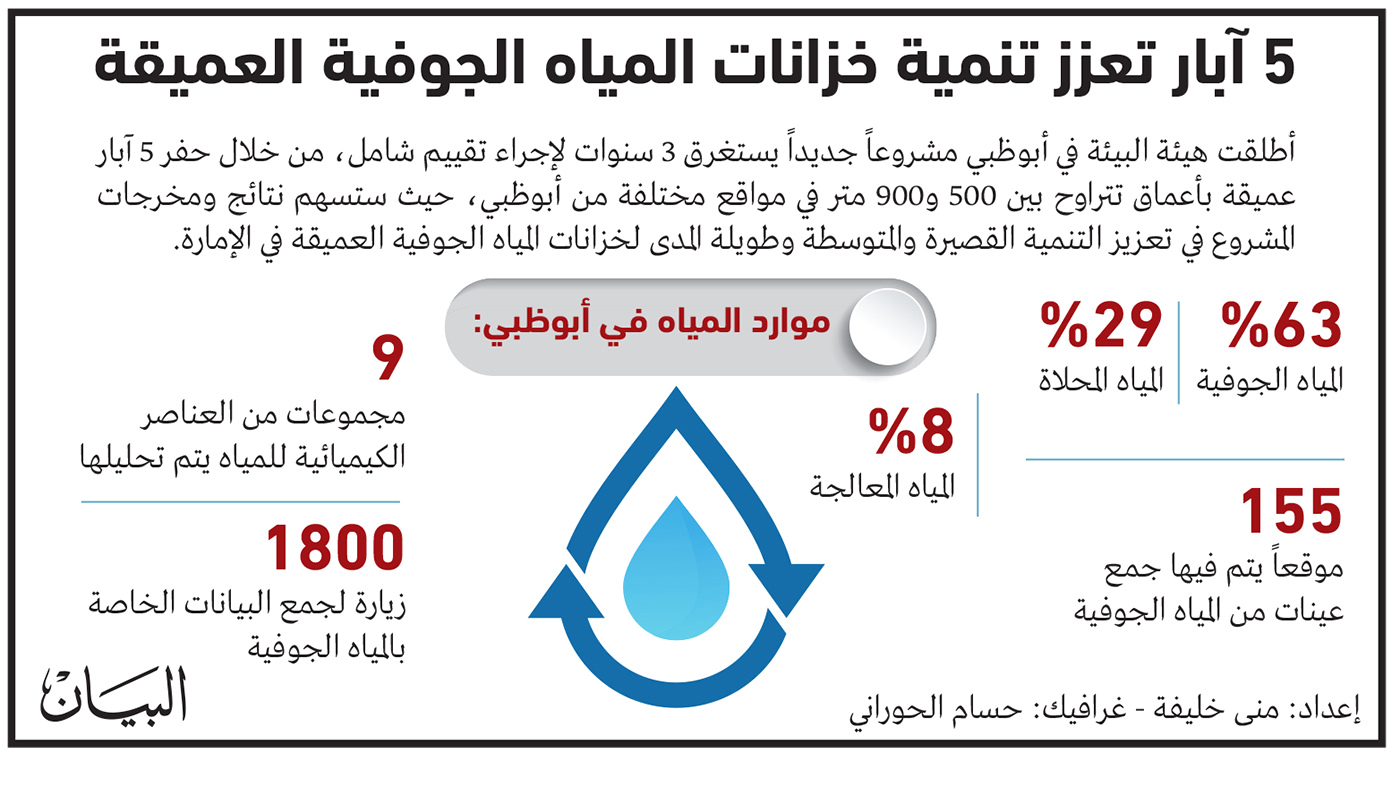 وأشار التقرير السنوي لعام 2019 والصادر عن الهيئة مؤخراً، إلى أن إجمالي كمية المياه الجوفية في إمارة أبوظبي بلغ 642000 مليون متر مكعب تقريباً، في حين بلغت نسبة المياه الجوفية من إجمالي كمية المياه المستخدمة في الإمارة 63%، وبلغ معدل استخراج المياه الجوفية في عام 2019 بالإمارة حوالي 2070 مليون متر مكعب.