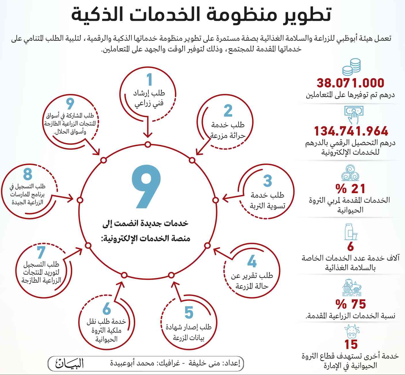 قدّمت هيئة أبوظبي للزراعة والسلامة الغذائية، خلال الربع الأول من العام الجاري، أكثر من 142 ألف خدمة متنوعة للمتعاملين، عبر منظومتها الخدمية التي تتضمن 49 خدمة مختلفة، والتي يتم التقديم عليها من خلال التطبيق الذكي والموقع الإلكتروني ومراكز خدمة المتعاملين التابعة للهيئة والموزعة على مناطق إمارة أبوظبي كافة، وهو الأمر الذي انعكس بشكل إيجابي على المجتمع والأفراد والبيئة، إذ بلغ عدد الزيارات التي تم توفيرها على المتعاملين 276.880 ألف زيارة، في حين انخفضت نسبة انبعاثات غاز ثاني أكسيد الكربون إلى 2.027 طن.