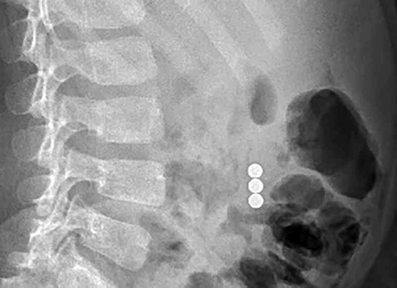 وبعد إجراء فحوصات الأشعة السينية تبين وجود ثلاث قطع مغناطيس في بطن الطفل، وعلى الفور تم استدعاء الدكتور عادل الجنيبي، استشاري جراحة الأطفال لمعاينة الطفل، الذي أجرى فحصًا شاملاً واكتشف أن الطفل قام بابتلاع قطع المغناطيس الثلاثة في أوقات مختلفة ما يفسر تواجدها في مواقع مختلفة في الأمعاء.