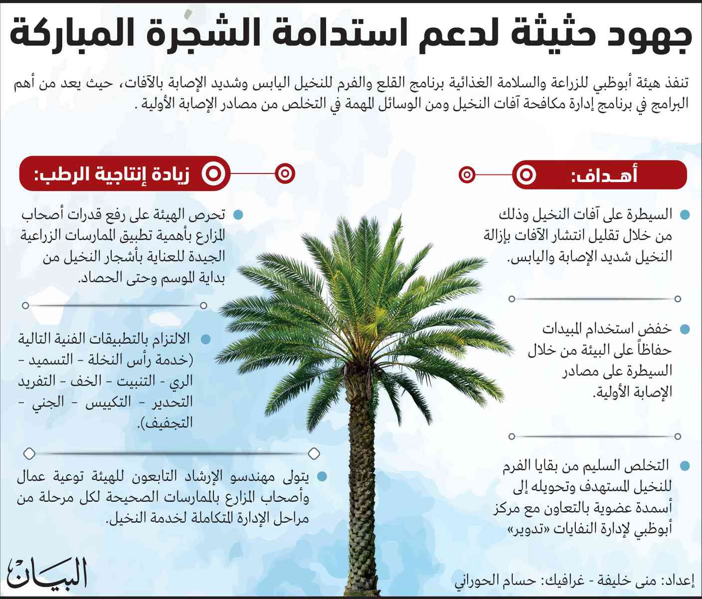 وأفادت الهيئة أنها تتبع استراتيجية متكاملة تهدف إلى ضمان الأمن الحيوي بشقيه النباتي والحيواني، حيث تولي أهمية خاصة لمكافحة الآفات التي تصيب النخيل وذلك من أجل المحافظة على هذه الشجرة المباركة لما لها من أهمية في الموروث الحضاري لدولة الإمارات والمنطقة، بالإضافة إلى الأهمية البيئية والاقتصادية وأيضا باعتبارها داعماً أساسياً للأمن الغذائي، حيث تطبق الهيئة برنامج الإدارة المتكاملة لآفات النخيل، من أجل السيطرة على آفات النخيل بطرق آمنه بيئياً ومتوافقة مع إجراءات الإدارة المتكاملة للآفات، وذلك لتقليل الضرر الاقتصادي الذي قد تحدثه الآفات على النخيل خصوصا سوسة النخيل الحمراء، والمحافظة على النظام البيئي من التلوث نتيجة الاستخدام المكثف للمبيدات الزراعية.