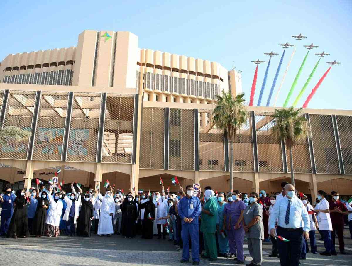 قام سرب فرسان الإمارات للاستعراضات الجوية التابع للقوات الجوية والدفاع الجوي لدولة الإمارات العربية المتحدة، بالمرور فوق عددٍ من مستشفيات بدبي حيث قامت بإجراء استعراض جوي مميز.