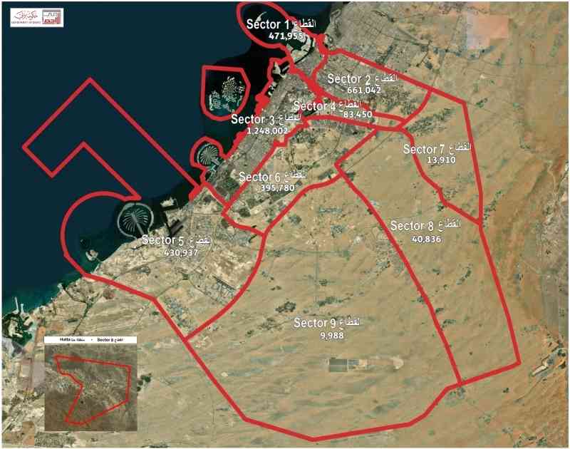 وأظهرت البيانات أن دبي تقسم إلى 9 قطاعات تخطيطية، وبالنظر إلى توزيع السكان حسب القطاعات الرئيسية في نهاية عام 2019، تركز 37.19% من السكان في القطاع «3»، حيث بلغ عدد السكان في هذا القطاع مليوناً و248 ألفاً و2 نسمة، يليه القطاع «2»،حيث بلغ عدد السكان فيه 661 ألفاً و42 نسمة بنسبة قدرها 19.70% وجاء القطاع«1» في المرتبة الثالثة، حيث بلغ عدد السكان فيه 471 ألفاً و955 نسمة بنسبة بلغت 14.06%، في المقابل بلغ عدد سكان القطاعات من«7- 9»مجتمعة 64 ألفاً و734 نسمة بنسبة قدرها 1.93% من إجمالي سكان الإمارة.