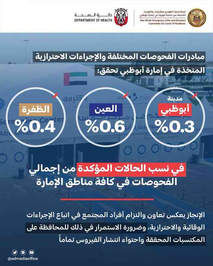 أعلنت لجنة إدارة الطوارئ والأزمات والكوارث في أبوظبي عن نتائج مبادرات الفحوصات المختلفة والإجراءات الاحترازية المتخذة في الحد من انتشار فيروس كوفيد-19، إذ انخفضت نسب الحالات المؤكدة من إجمالي الفحوصات في كافة مناطق الإمارة، فبلغت النسبة في مدينة أبوظبي 0.3%، وفي الظفرة 0.4٪ وفي العين 0.6٪.