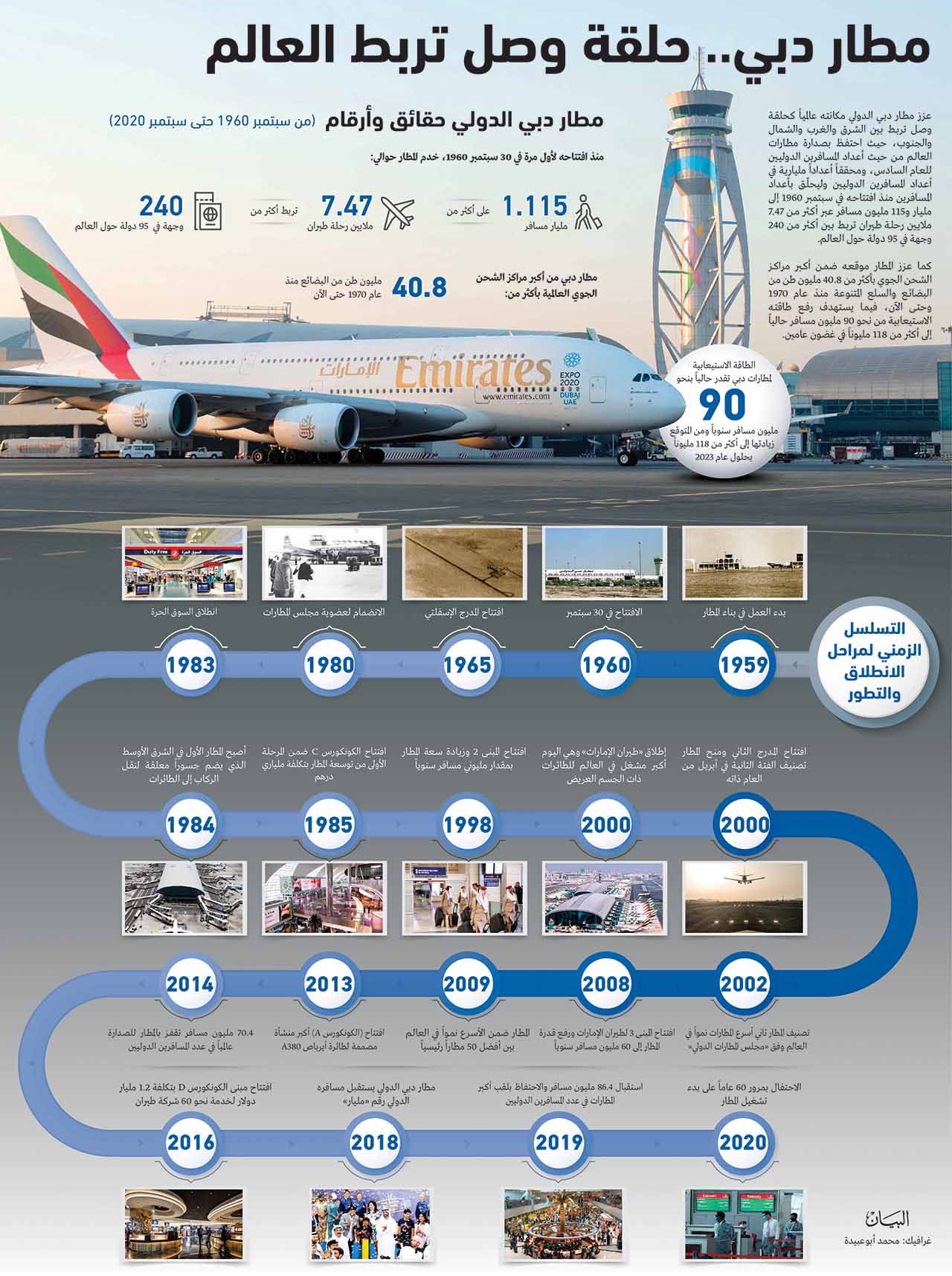 كما عزز المطار موقعه ضمن أكبر مراكز الشحن الجوي بأكثر من 40.8 مليون طن من البضائع والسلع المتنوعة منذ عام 1970 وحنى الآن، فيما يستهدف رفع طاقته الاستيعابية من نحو 90 مليون مسافر حالياً إلى أكثر من 118 مليوناً في غضون عامين.