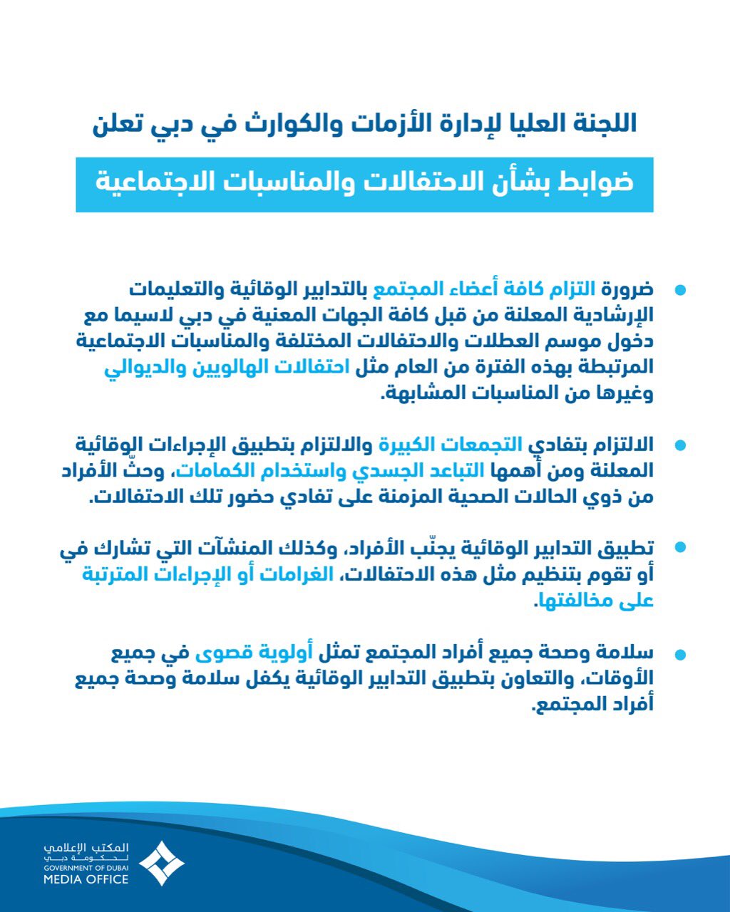 -ضرورة التزام كافة أعضاء المجتمع بالتدابير الوقائية والتعليمات الإرشادية المعلنة من قبل كافة الجهات المعنية في دبي لاسيما مع دخول موسم العطلات والاحتفالات المختلفة والمناسبات الاجتماعية المرتبطة بهذه الفترة من العام مثل، احتفال الهالويين والديوالي وغيرها من المناسبات المشابهة.