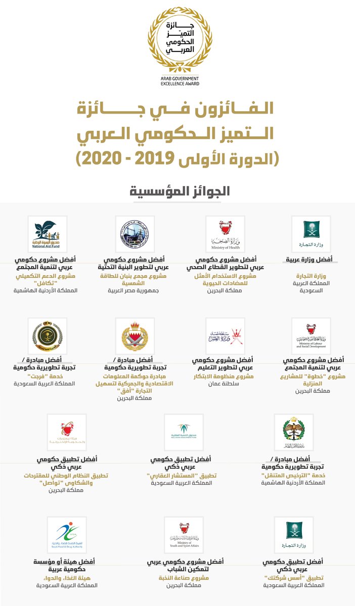 برعاية صاحب السمو الشيخ محمد بن راشد آل مكتوم، نائب رئيس الدولة رئيس مجلس الوزراء حاكم دبي، رعاه الله،، أعلن مجلس أمناء جائزة التميز الحكومي العربي عن أسماء الفائزين بجوائز الدورة الأولى، وذلك خلال حفل افتراضي شارك فيه عدد من الوزراء والمسؤولين وممثلين من الحكومات العربية.