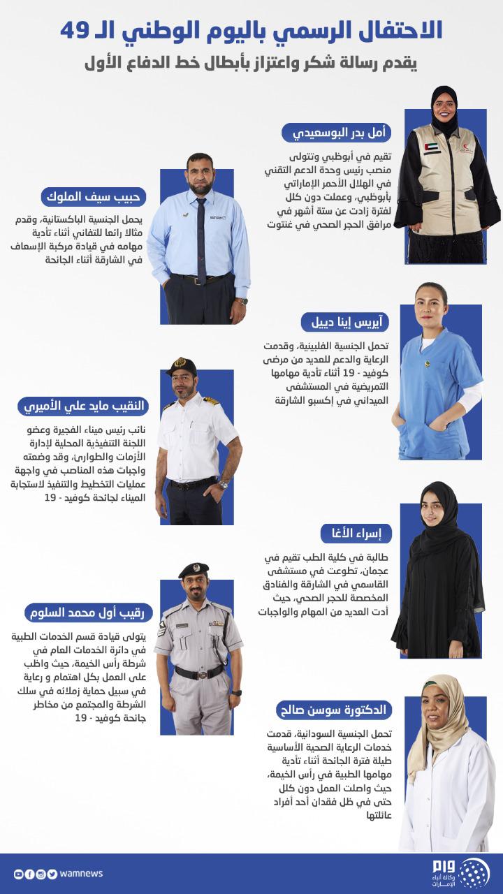 وتضمن الاحتفال الرسمي رسائل وشهادات قدمها سبعة من العاملين في الخطوط الأمامية الذين تشكل تجربتهم مثالا على الشجاعة والإيثار والتضحيات البطولية التي يقدمها الآلاف من المعنيين العاملين على خط الدفاع الأول والتي شهدتها الدولة خلال هذا العام، وتضمنت قائمة أبطال خط الدفاع الأول الذين قدم الاحتفال شهاداتهم كلًا من :