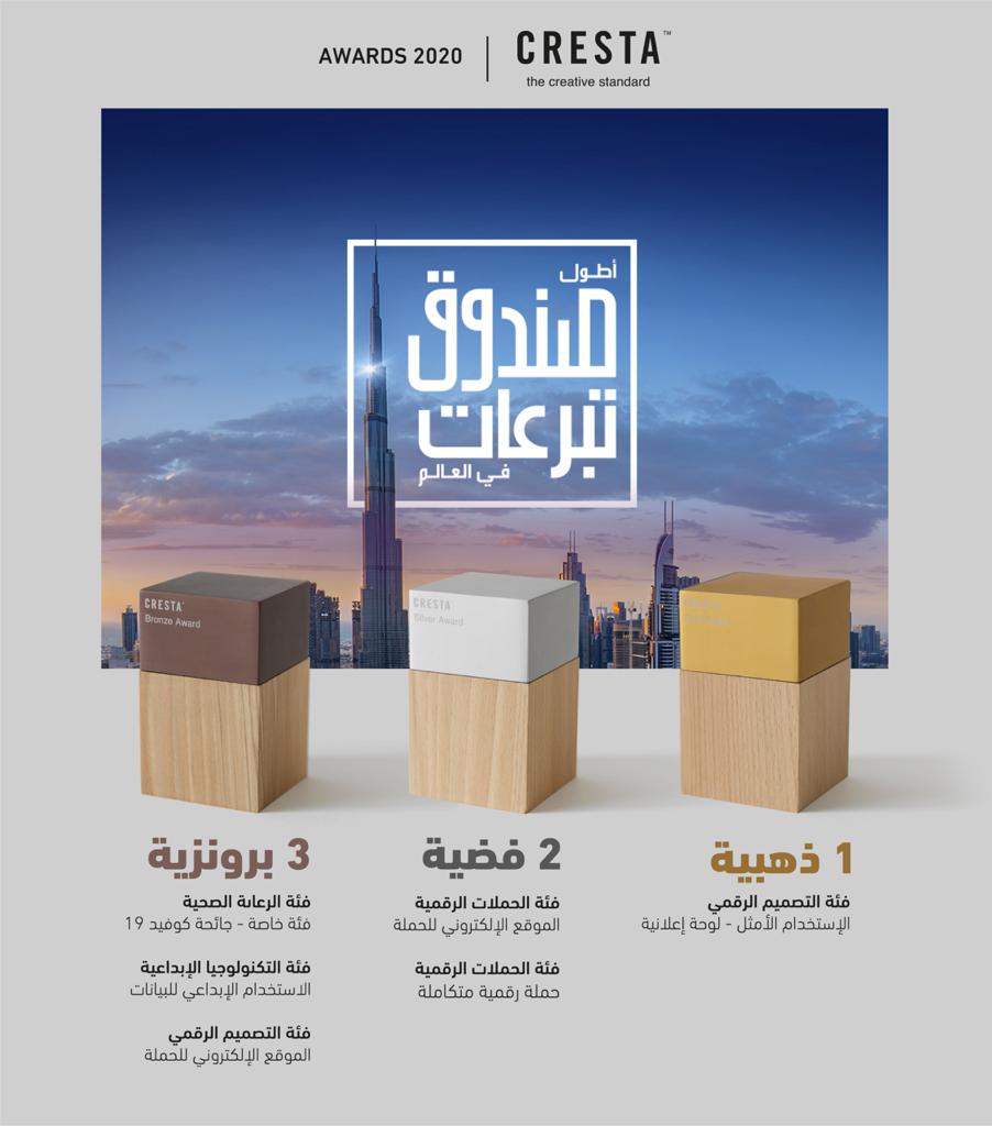 وقدمت جوائز "كريستا" العالمية Cresta؛ المتخصصة في الحملات الإبداعية بمختلف قطاعاتها والتي تقدم جوائزها في المجال الإبداعي ضمن 24 فئة مختلفة، 6 جوائز لمبادرة أطول صندوق تبرعات في العالم الداعمة لحملة 10 ملايين وجبة في العالم.