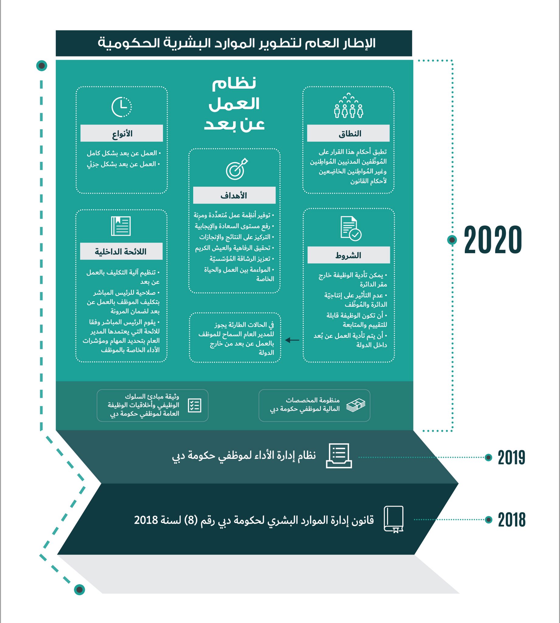 جاء ذلك بمناسبة اعتماد سمو ولي عهد دبي رئيس المجلس التنفيذي نظام العمل عن بُعد في حكومة دبي، وهو نظام عمل يتماشى مع متطلبات وظائف المستقبل، يقوم فيه الموظف بتأدية مهامه وواجباته من مواقع مختلفة عن مقر العمل، وذلك باستخدام وسائل الاتصال وتقنية المعلومات، بهدف توفير أنظمة عمل متعددة ومرنة تتماشى مع توجهات الحكومة، وتتوافق مع أفضل الممارسات العالمية، وتواكب وظائف المستقبل، وتعزّز الإنتاجية من خلال التركيز على النتائج والإنجازات.