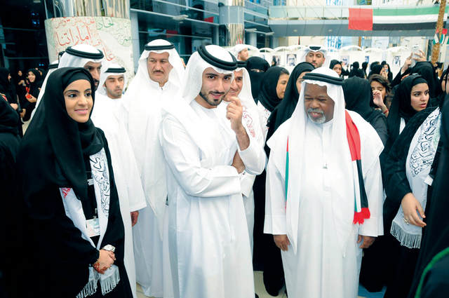 وقال بلال البدور: إن افتتاح سمو الشيخ ماجد بن محمد بن راشد آل مكتوم للمعرض يمثل دفعة كبيرة لهذه الفعالية التي حرصت وزارة الثقافة والشباب وتنمية المجتمع على تنظيمها في رحاب جامعة زايد ووسط اساتذتها وطالباتها حتى يتعرف أبناء الأجيال الجديدة على تاريخ وطنهم والأعمال التي ترصد ما قام به الآباء المؤسسون من جهود ضخمة لرسم نهضة هذا الوطن، والحفاظ على وحدته والتلاحم بين أفراده، مضيفاً أن وزارة الثقافة حريصة على مشاركة كافة مؤسسات الدولة وخاصة التعليمية منها في الاحتفال باليوم الوطني الـ41 الذي يمثل مناسبة وطنية سامية، يتكامل فيها الحرص على القيم والعادات الإماراتية الأصيلة مع النظر إلى المستقبل ودعم الاجيال الجديدة.