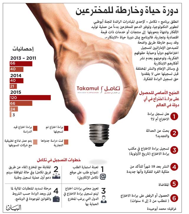 كشف فيصل الحمودي مدير برنامج «تكامل» التابع للجنة أبوظبي لتطوير التكنولوجيا، لـ«البيان» عن تمكن البرنامج من رفع أعداد براءات الاختراع التي سجلتها دولة الإمارات إلى 120 براءة اختراع دولية، وأن هناك 24 براءة اختراع حالياً قيد الدراسة منذ بداية العام الحالي 2015..