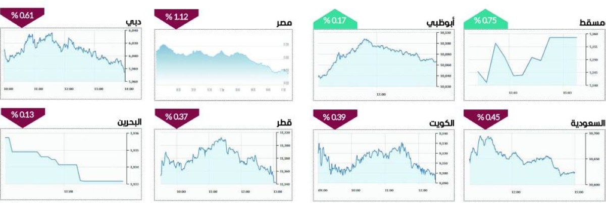 شهدت معظم البورصات العربية تراجعاً في الأداء، إذ تراجع «تاسي» السعودي 0.45%، والكويتي 0.39%، والقطري 0.37%، والبحرين 0.13%، في حين ارتفعت بورصة مسقط 0.75%.