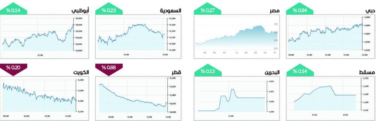 وشهدت أغلب مؤشرات الأسواق العربية ارتفاعاً في الأداء، إذ صعد المؤشر السعودي «تاسي» 0.23%، ومسقط 0.14%، والبحرين 0.13%، بينما تراجعت بورصتا الكويت 0.20%، وقطر 0.88%، وخارج منطقة الخليج، قفز مؤشر بورصة مصر 0.27%.